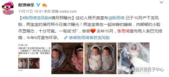 近日,张雨绮的经纪人公开了一组张雨绮喜获龙凤胎的照片,龙凤胎美宝一笔成“好”,萌态十足地靠在一起安静熟睡,网友纷纷祝贺雨绮收获了人生的美满。据悉,2016年10月26日,张雨绮在微博正式公布与相识七十天的袁巴元结婚。今年6月又公布了赴美待产的喜讯,如今成功诞下龙凤胎美宝,令网友羡慕不已,可谓是人生赢家了。