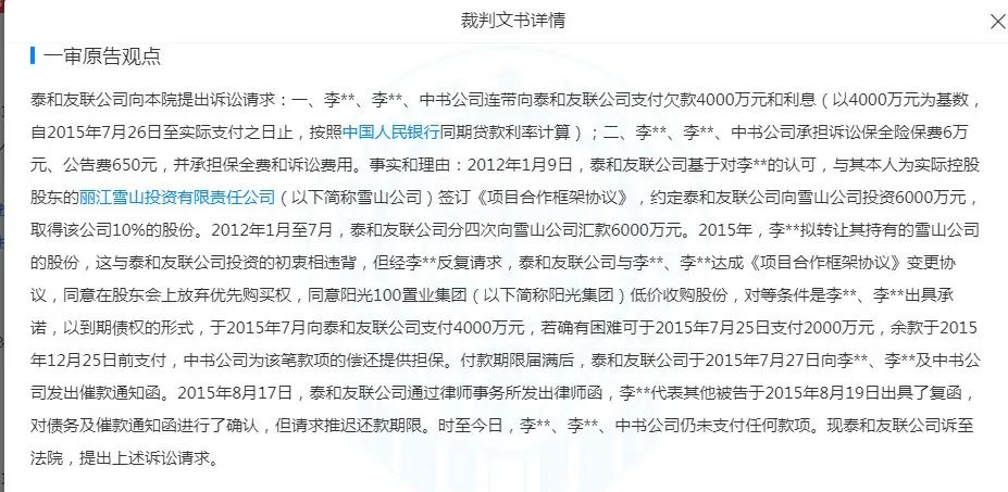 关联案件详情显示,北京泰和友联投资有限公司曾出资6000万元对李亚鹏兄弟二人公司(丽江雪山投资有限责任公司)进行注资,并约定获得雪山公司10%的股份,项目3年开发周期届满后,由泰和友联公司先行收回约定的固定权益收益4000万元。因李亚鹏一方一直未支付相关款项,泰和友联公司在催款无果后,将李亚鹏、李亚炜和担保公司诉至北京市朝阳区人民法院。