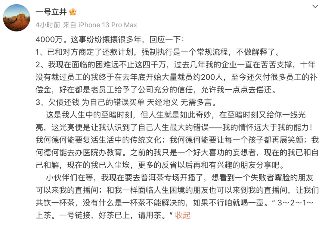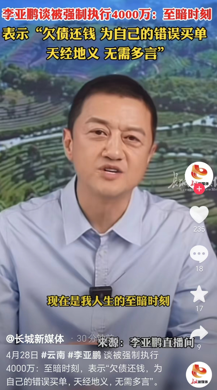 李亚鹏还表示,自己面临的困难远不止这4000万元,他承认自己的“情怀远大于能力”,但他也表示,“欠债还钱,为自己的错误买单,天经地义,无需多言。”