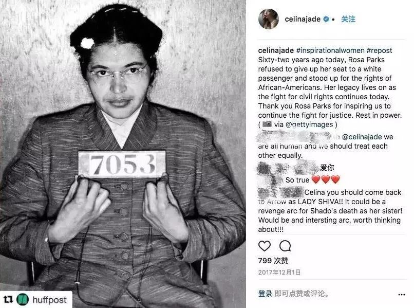她祭奠黑人民权领袖Rosa Parks,为少数族裔的权益和社会正义打call;