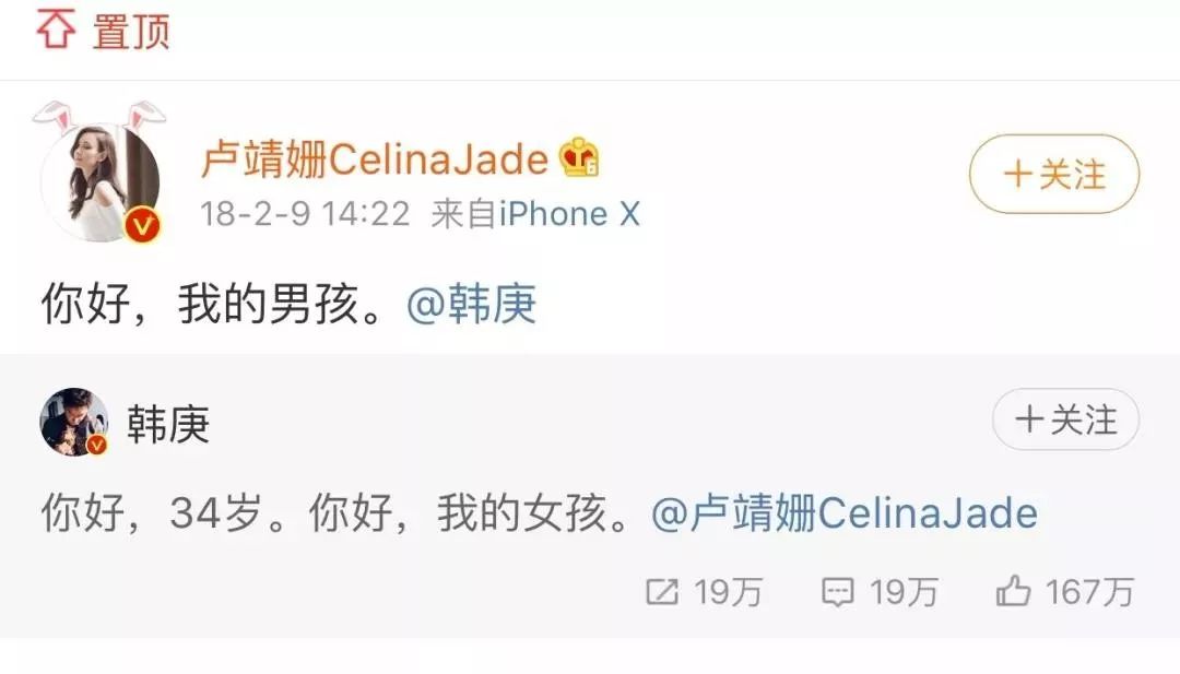 2018年2月,韩庚生日当天,两人发表微博公开恋情,“男孩女孩”官宣体撒足了狗粮。
