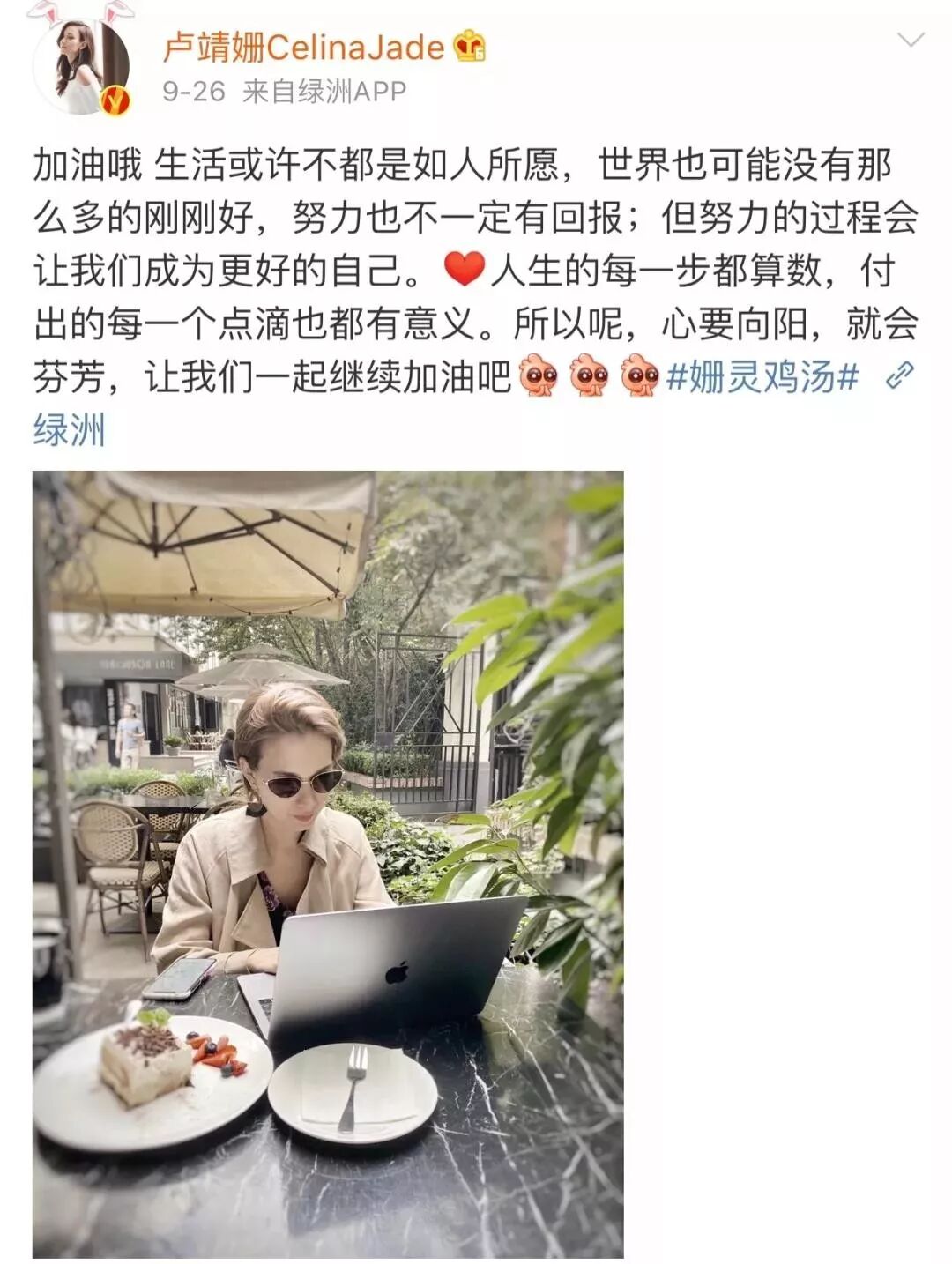 卢靖姗的微博有个小标签叫“姗灵鸡汤”,隔三差五给大家推送暖心段子,尽一己之力向粉丝们传播着正能量。