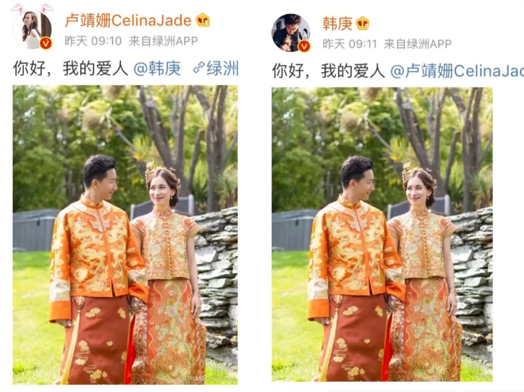 他俩发出一模一样的情侣款微博:“你好,我的爱人”,晒出一摸一样的婚礼现场照片。照片上两人身穿中式喜服,相视而笑,充满爱意。