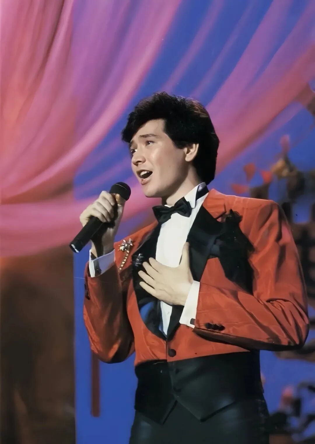 费翔身形高大,穿着红色礼服,一头乌黑茂密卷发,用浑厚的嗓音唱《故乡的云》,“归来吧归来呦,浪迹天涯的游子,我已厌倦漂泊……”