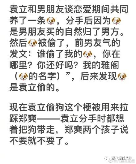 由此还衍生出了一个新梗:“袁立偷狗”。用来拉踩郑爽,袁立分手都要带走狗,郑爽俩孩子说不要就不要了。