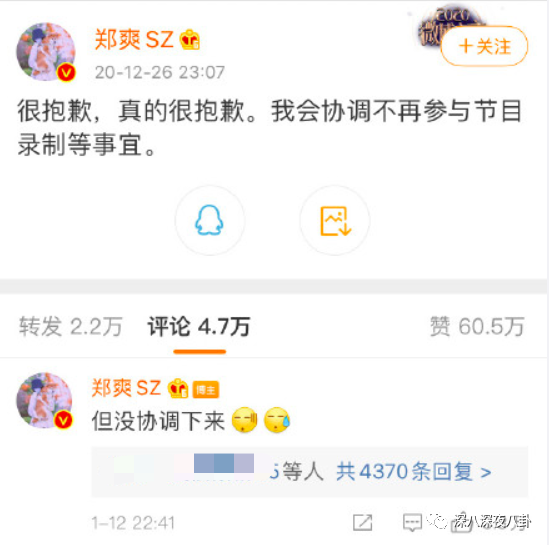 想必上半月协调不下来的退出综艺录制,现在是能协调下来了。至少在这件事上,郑爽如愿了。