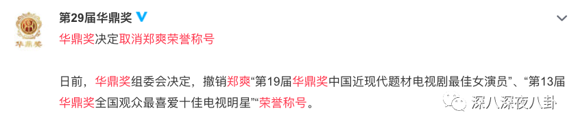 此外,华鼎奖也取消了郑爽的荣誉称号。