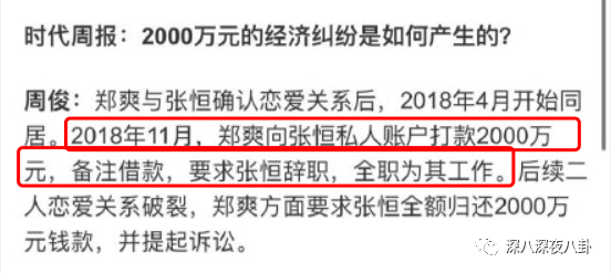 郑张认识谈恋爱--打款2000万开公司--公司烧钱郑爽累了不追加款-- 闹掰分手--郑告张追讨2000万。