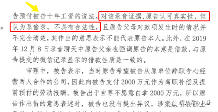 张恒提交了录音证据,说明这笔钱是经济补偿,以及预付十年的劳动报酬。法院判决书写的是:录音是真实的,但是偷录这个行为不不具合法性。