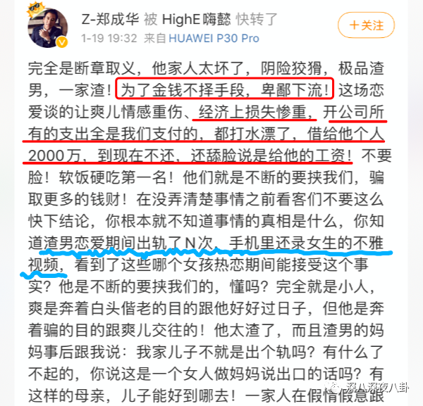 郑爽爸爸这篇给人的观感就是:我女儿跟他好开公司搭了好多钱,张恒为了金钱不择手段,我们不会给他一分钱。