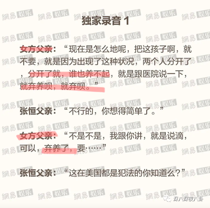 * 录音1曝光:代孕过程中,双方父母讨论孩子的问题,“7个月了不能打孩子”,郑家人建议弃养。张恒父亲不同意。