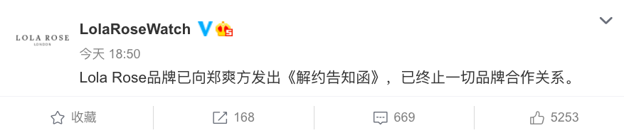 * Prada集团终止与郑爽女士所有合作关系。