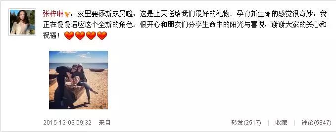随后,张梓琳在微博上写道,家里要添新成员,她自己也在慢慢适应这个全新的角色,很开心和朋友们分享生命中的阳光和喜悦,并感谢大家的祝福。同时晒出了和老公的合照。