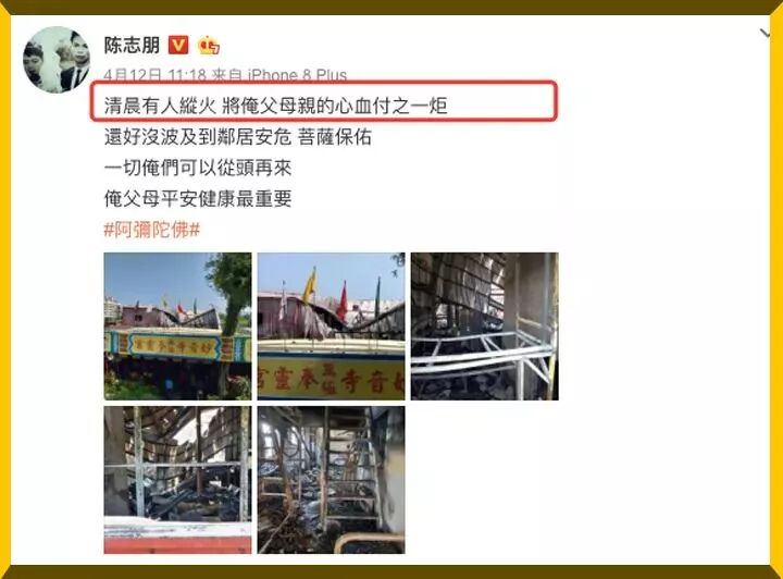 事后陈志朋痛发微博,父母几十年的心血付之一炬,