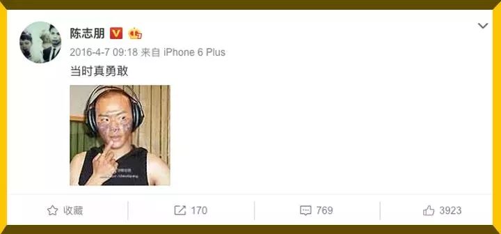 一个月后,他主动公开一张旧照,并配文“当时真勇敢”。
