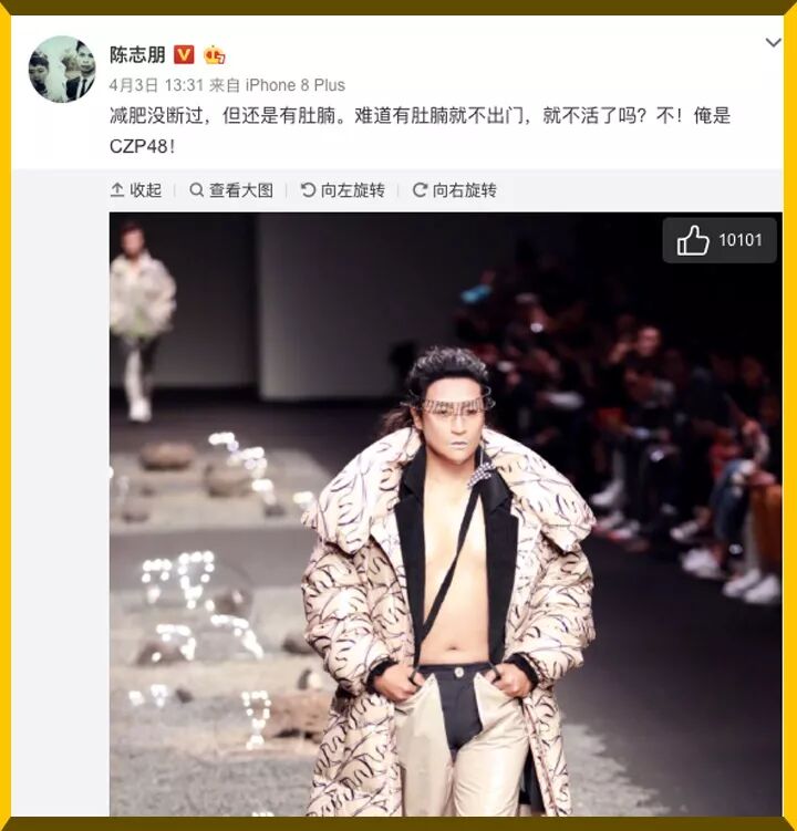 他走秀,人们的关注点在他发福的身材和日益凸显的小肚腩上。