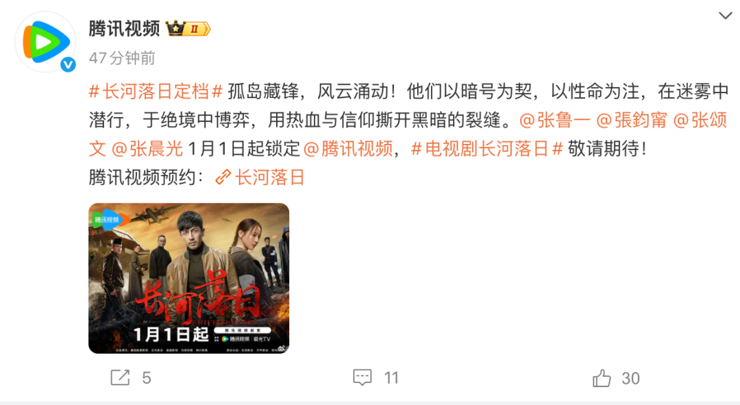 #长河落日定档 孤岛藏锋,风云涌动!他们以暗号为契,以性命为注,在迷雾中潜行,于绝境中博弈,用热血与信仰撕开黑暗的裂缝。@张鲁一 @張鈞甯 @张颂文 @张晨光 1月1日起锁定@腾讯视频,#电视剧长河落日 敬请期待!