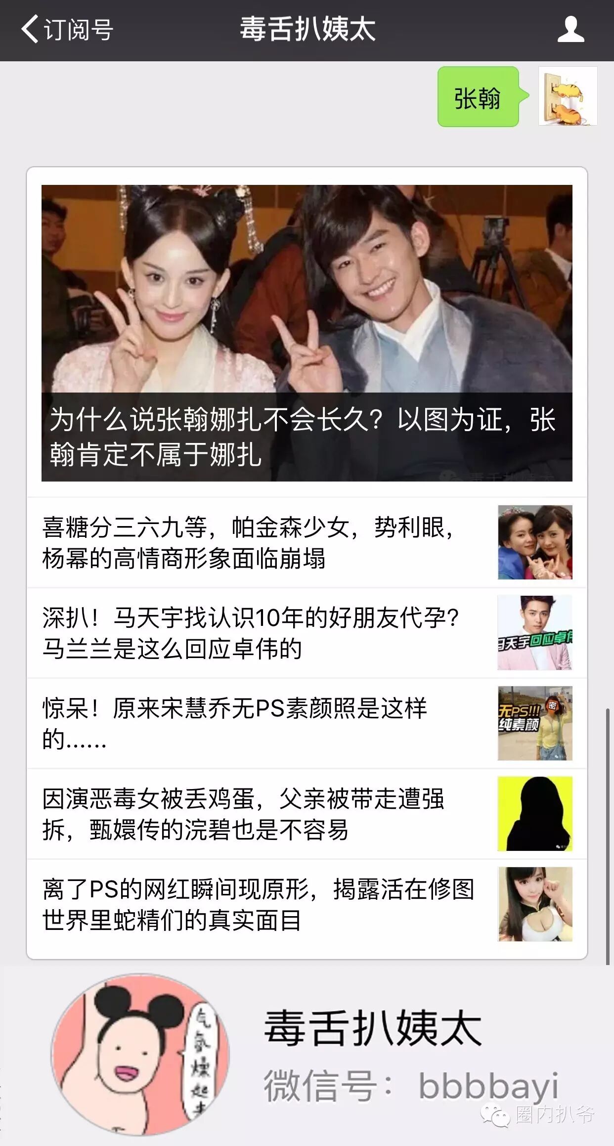 看扒爷一个人讲八卦腻不?来关注扒爷CP,毒舌扒姨太吧!一手明星猛料,时尚小公举,最浪毒舌妇就是她! 关注后回复关键词:【张翰】 就有猛料哦!
