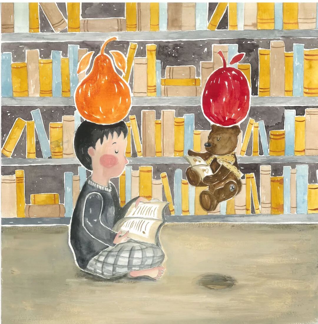 “在画了近百张草图后,这个小男孩开始在我的生活里打转,停滞不前了,直到这个八月丁香带我认识了梨枣书店,小男孩带着他的小熊也走进了梨枣,我也重新有了动力。”。