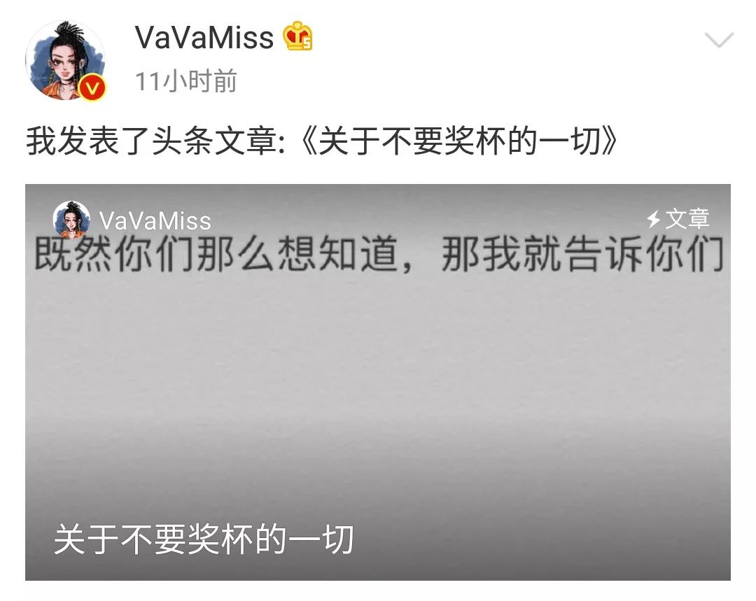 而后,VaVa微博发表头条文章《关于不要奖杯的一切》,网友们又将话锋一转,将枪口对准了主持人安琥。