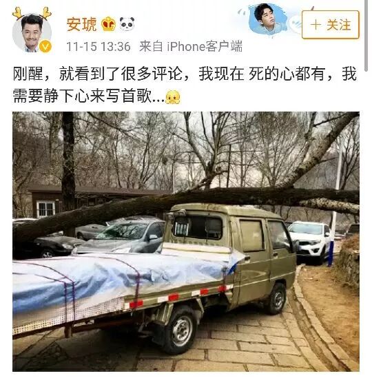 大概是因为网友的炮火太过猛烈,今天中午安琥在微博上直言:刚醒,就看到了很多评论,我现在死的心都有,我需要静下心来写首歌…