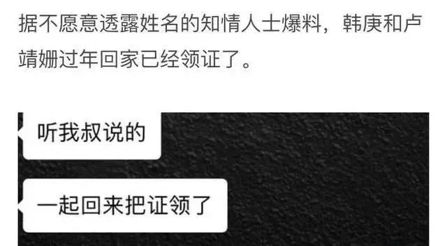 大年初六,有网友爆料称韩庚和卢靖姗这次回家过年已经领证了,这让不少网友非常的抓狂啊,俩人从去年颁奖以来到现在也才相识不到半年,没想到从公开恋情到回家过年,短短半个月,进展居然已经这么神速了