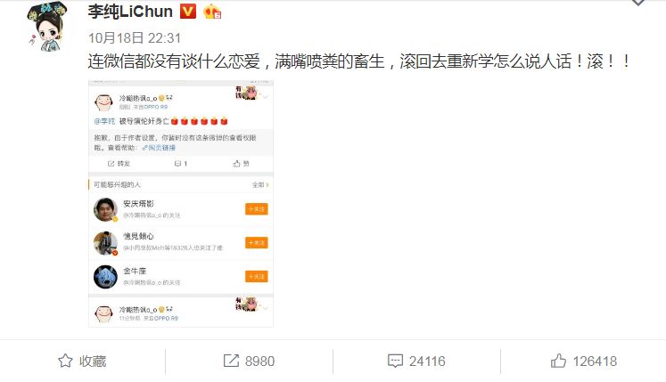 终于,铺天盖地的谩骂让李纯妹子忍无可忍...开始发微博辟谣。