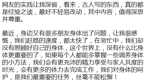 我后来大力推广这个方子,很多人受益,我觉得妇女养血的手段太少,这个方子可以帮助到大家,尤其是妇女,在生过孩子后,很多妇女血虚,可是却没有调养过来,很多妇女生孩子后体质一落千丈,如果现在能把血养足,则会身体健康很多。所以王孟英说:“产妇临盆服之,尤妙”。但是大家要记住,孕妇忌服,就是孕妇不要服用。而产后则最适合服用的,对产后恢复很好。