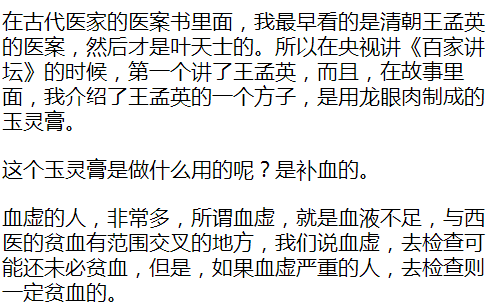 而王孟英的玉灵膏,是我特别推荐的养血的方子,王孟英说“玉灵膏一名代参膏。自剥好龙眼,盛竹筒式瓷碗内,每肉一两,入白洋糖一钱,素体多火者,再入西洋参片,如糖之数。碗口幂以丝绵一层,日日于饭锅上蒸之,蒸到百次。凡衰羸、老弱,别无痰火,便滑之病者,每以开水瀹服一匙,大补气血,力胜参芪。产妇临盆服之,尤妙。”