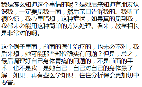 再说一位患者,更加离奇,她每天夜里,胃部会突然抽动般剧痛,非常恐怖,她的一位亲戚,是北京一个大医院的某科室主任,于是去那个医院求诊,这个医院不知道为何,认为她心脏有问题,可能与此有关,于是给心脏做手术,下了两个支架。但是,手术后,胃部晚上剧痛依旧。于是再次检查,这次好像说是子宫有问题,于是切除,但是,术后依旧胃部疼痛,而且,出现了严重的水肿情况,这次有些棘手了,因为没有找到水肿的原因,所以无法具体处置。