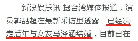 采访中郭品超还透露,自己已经决定在后年与女友马泽涵结婚。