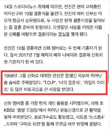 近年来,神话组合的人气已经大不如前,成员们也各自有了自己的事业,还有成员Eric结婚。最新的消息显示,组合成员JunJin朴忠载也将于10月结婚了。JunJin朴忠载除了在组合中的舞台外,还出演了如《九尾狐外传》、中国贺岁剧《你是我的梦》等影视剧作品。在2005年发行个人单曲曾经获得过人气歌谣第一位,以及多个颁奖礼的大奖可见个人营业也受到了大家的支持和欢迎。
