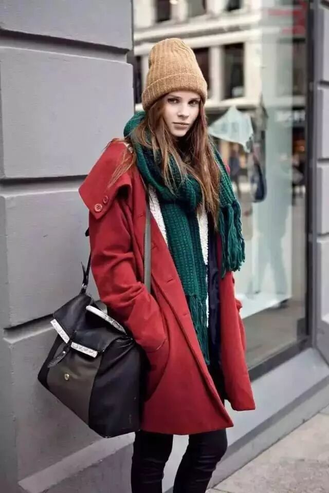你也可以随意的围上绿色的围巾,这种红加绿的撞色在冬天也是real吸引眼球。