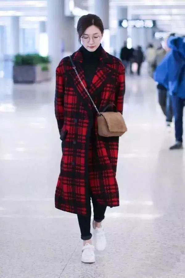 今年的一大流行就是格纹大衣,江疏影就利用红黑格纹大衣搭配黑色小脚裤,简简单单却不落俗套,是仙女们日常穿搭的模板啊!