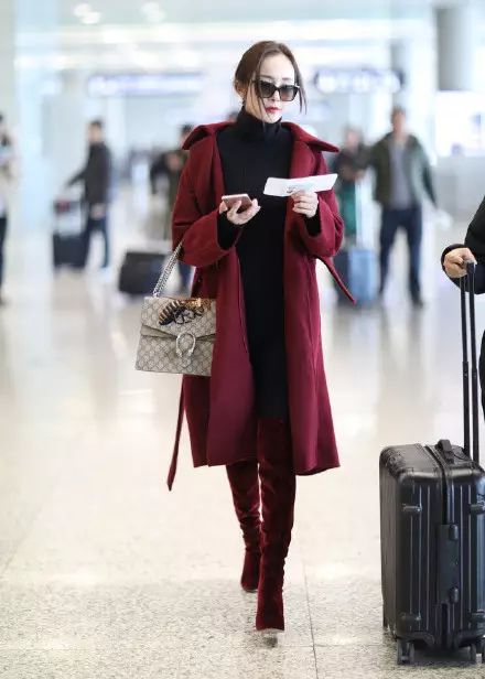 杨幂作为机场穿搭的杠把子很少出错,利用酒红色大衣搭配同色系高筒靴,内穿黑色紧身小高领,虽然大面积使用红色,但却完美诠释了红加黑的经典搭配。