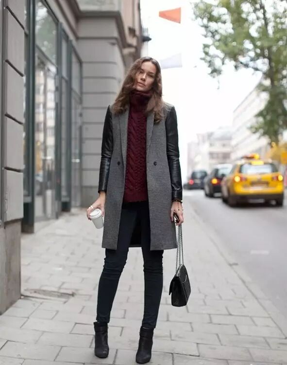 当然最不废脑筋还不出错的穿搭就是酒红色的内搭配灰色外套啦,皮质感的拼接灰外套利落帅气,脚蹬同色系靴子,简单又利落,实穿性也很强。
