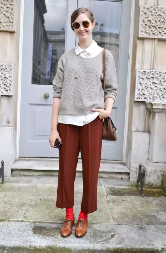 选择酒红色的微喇裤搭配灰色毛衣,点睛之笔在于一双亮红色的堆堆袜,提亮了整个造型,看起来精气神十足。