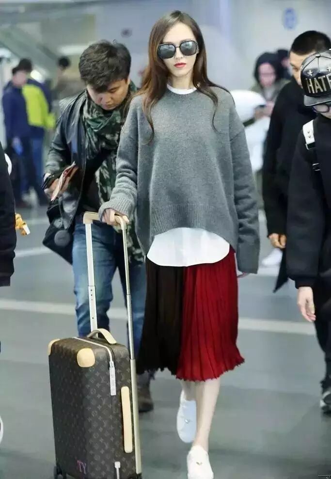 唐嫣这套机场穿搭chic感十足,过膝百褶裙也是今年大热的时尚单品,搭配上灰色宽松针织毛衣,也是一点不输好闺蜜呢。