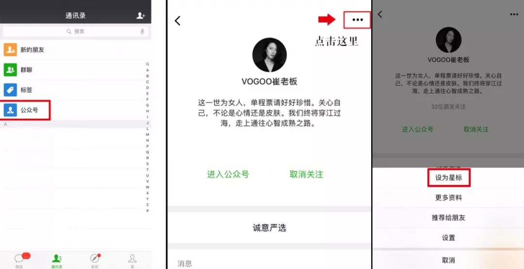1·找到公众号【VOGOO崔老板】,如图片中指示的那样,点击右上方的“…”。