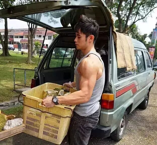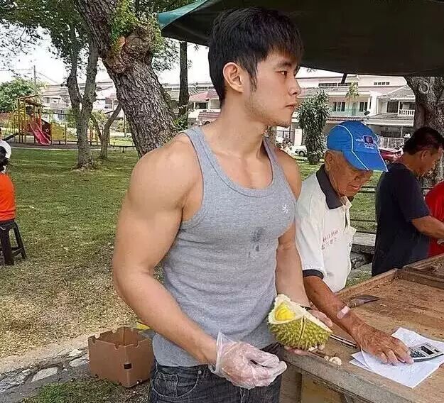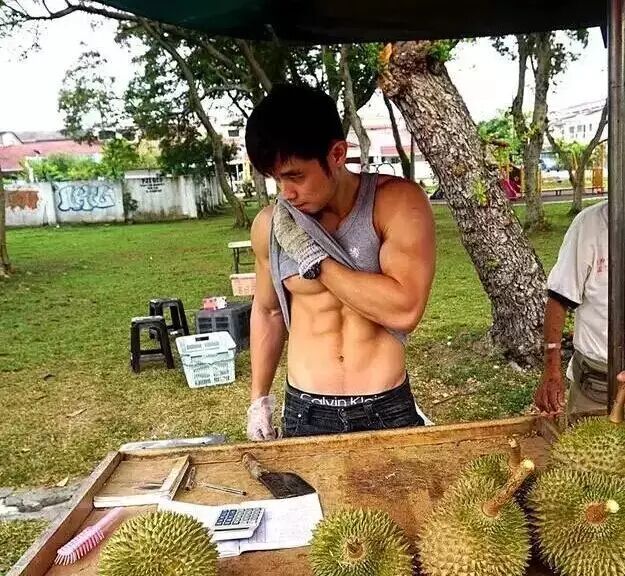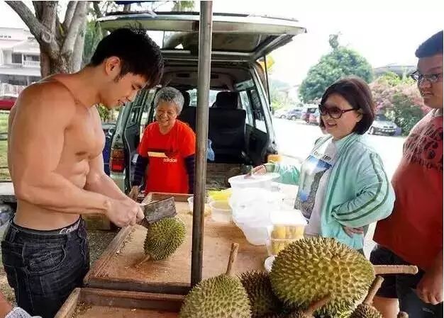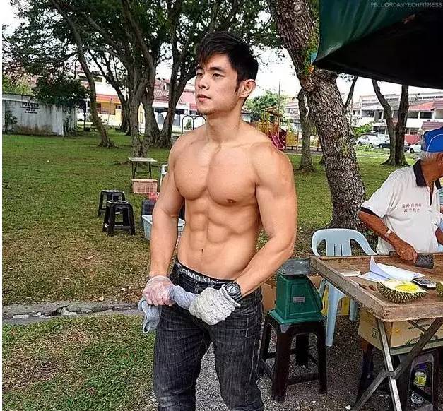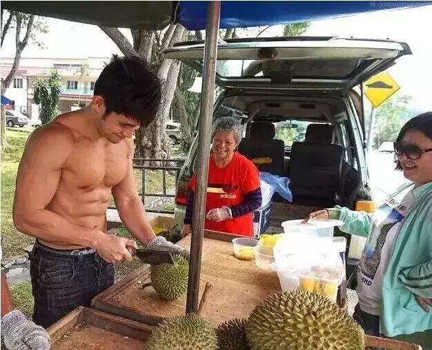 原来这位小哥也是有来头的,他名叫Jordan Yeoh,是马拉西亚一位健身教练兼模特,凭借自己阳光肌肉的形象,一次在帮街边阿伯阿妈卖榴莲的时候被顾客们围观,结果你懂的,火了!如今,他的社交账号上,每天的粉丝都疯长,女孩们纷纷留言说“吃什么榴莲,我要吃六块腹肌”,呃。。。