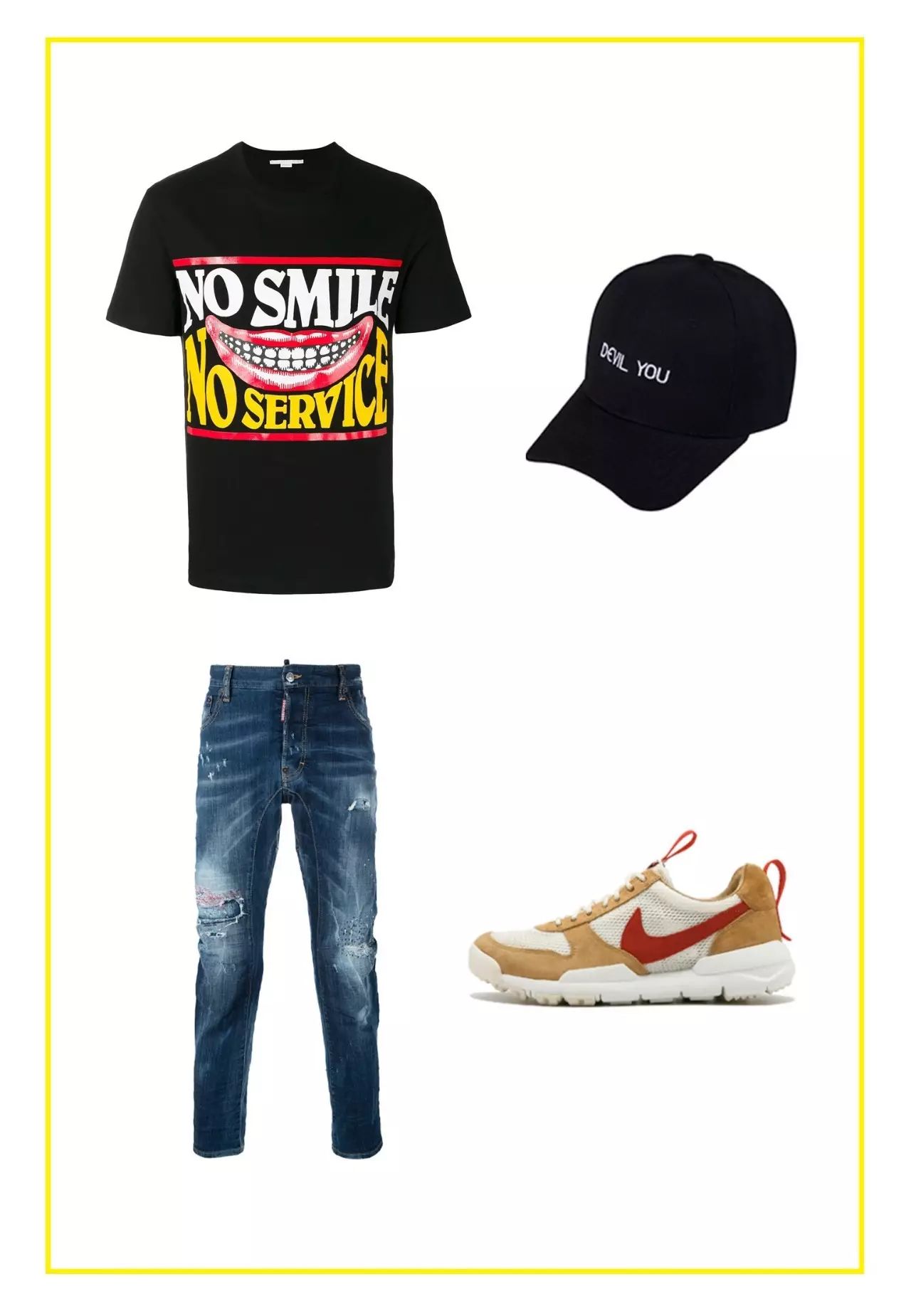 T恤:Stella McCartney 牛仔裤: DSQUARED2 帽子:Devil Beauty 鞋子:NIKE Mars Yard TS NASA