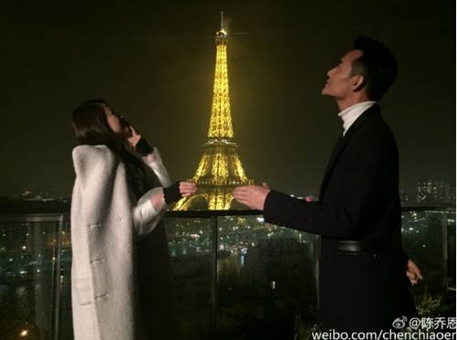 照片中两人一起坐旋转木马,一起在埃菲尔铁塔合照,一起在座椅上翘腿搞怪自拍,颜值高到配一脸。