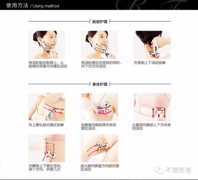 任何皮肤护理疗程都是需要时间积累蜕变的,做到两点:正确的使用手法+坚持使用,每天变瘦变美一点点。脸部使用时,可以从内向外,从下向上推。一般从下颌开始,稍微向脸外侧倾斜推30度推到额头即可。