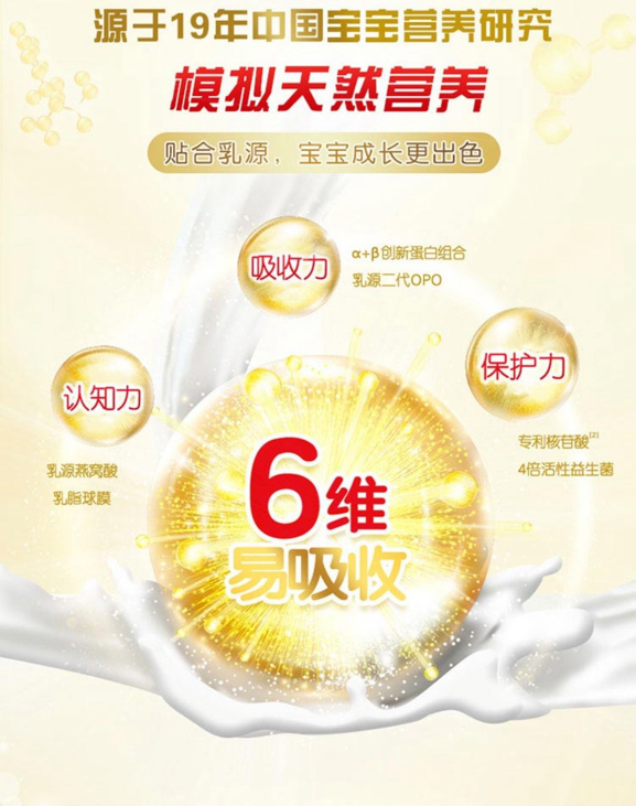 六维易吸收体系包括六大营养素:“α+β专利蛋白组合”、乳源二代OPO 、“专利核苷酸组合”、四倍进口活性益生菌、臻稀乳脂球膜、乳源燕窝酸,实现了在蛋白质、脂肪、核苷酸和磷脂等方面对母乳营养结构的系统模拟,可以更好地提高宝宝的吸收力、自护力和认知力。