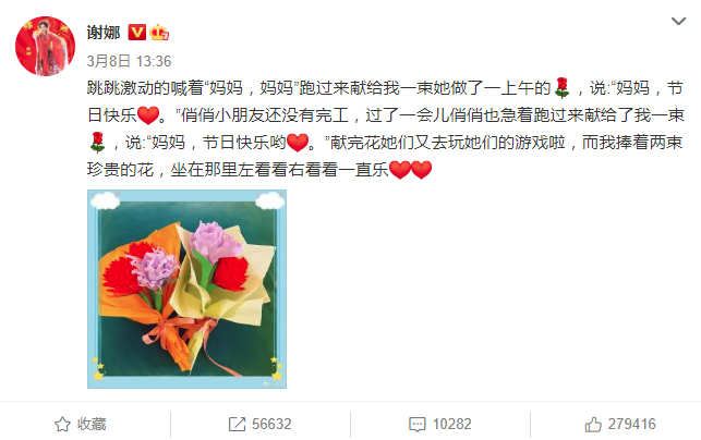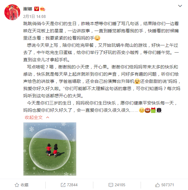 孩子们过三岁生日的时候,谢娜在微博写了一篇抒情的小作文,字里行间都是对孩子满满的爱意,说孩子是她的小天使、开心果,现在的快乐就是每天早上起床听到孩子们的声音。