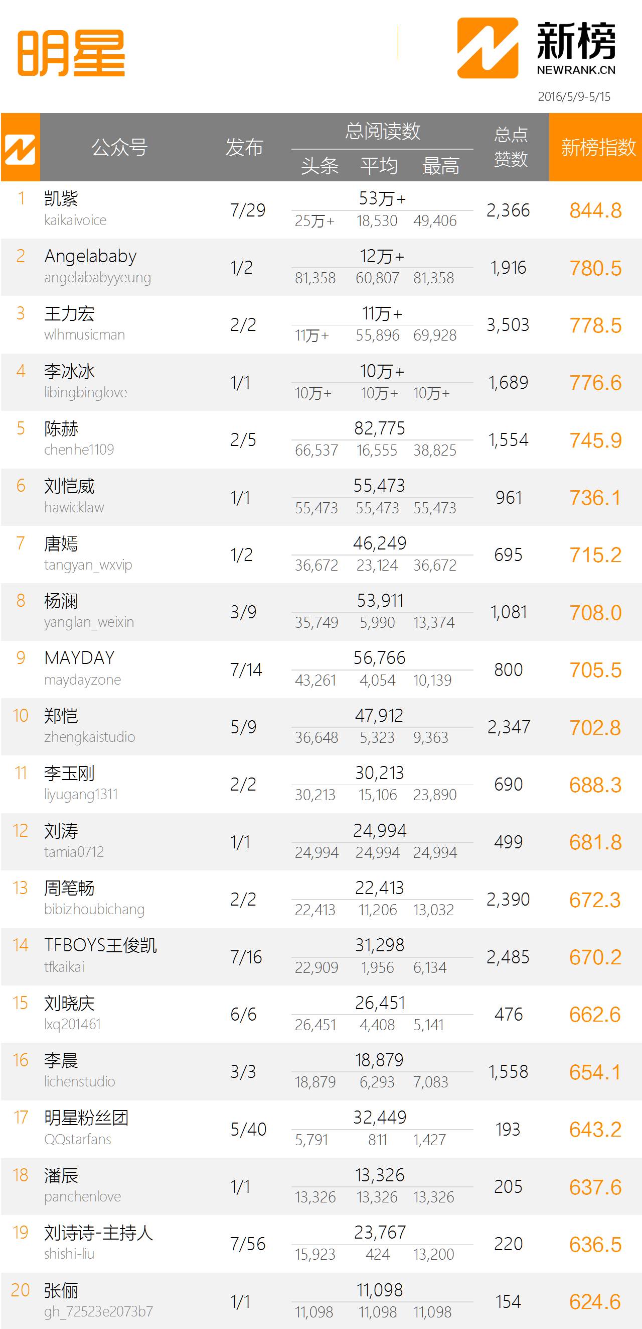 本周榜单王力宠庆生轰动台半个娱乐圈,瞬间霸屏,串升前三,Angelbaby、李冰冰、唐嫣等女神实力抢占前十,陈赫与张子萱共餐本就可以抢头条,还被拍有孕那更是头条中的头条,歌手方面李玉刚、周笔畅、TFBOYS王俊凯占得前二十位中的一席也算不易。