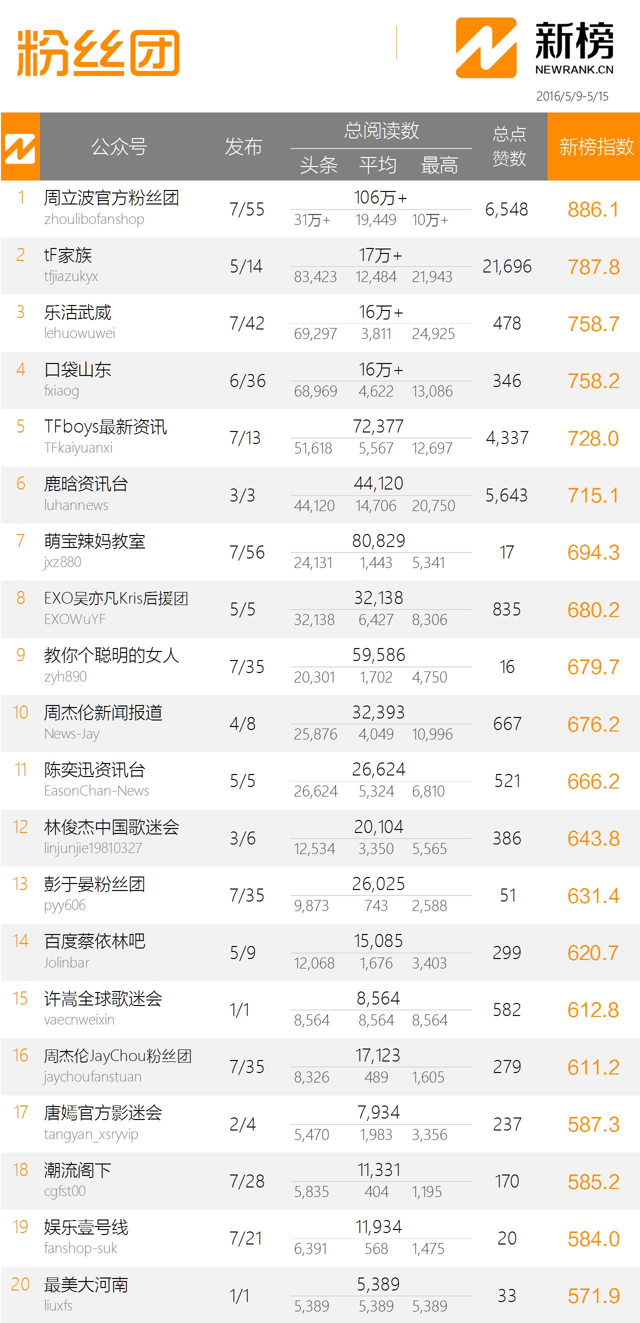 粉丝团方面,周立波官方粉丝团再度破百万,头条阅读量破31万,不得不说周老师还是相当的了得,TFboys前五中抢得两席,三小只的粉丝也是彪悍。鹿晗资讯台和吴亦凡Kris后援会前十中抢得一席之地,杰伦新闻报道本周抢进前十表现抢眼,陈奕迅、林俊杰、蔡依林、许嵩、唐嫣等的粉丝也在前二十中占得一席之地。