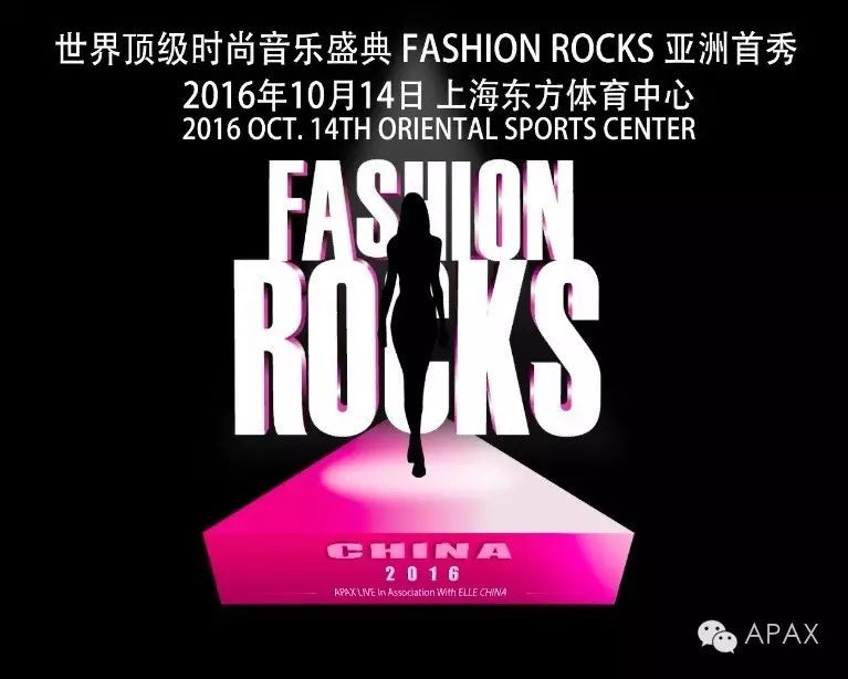 APAX LIVE is a newly developed division of APAX Group, uniting multi cultural entertainment concepts and experiences of Fashion Rocks. As the licensee and organizer of Fashion Rocks Asia, APAX LIVE will make it as Asian debut on 14th October 2016 at Shanghai Oriental Sports Centre.