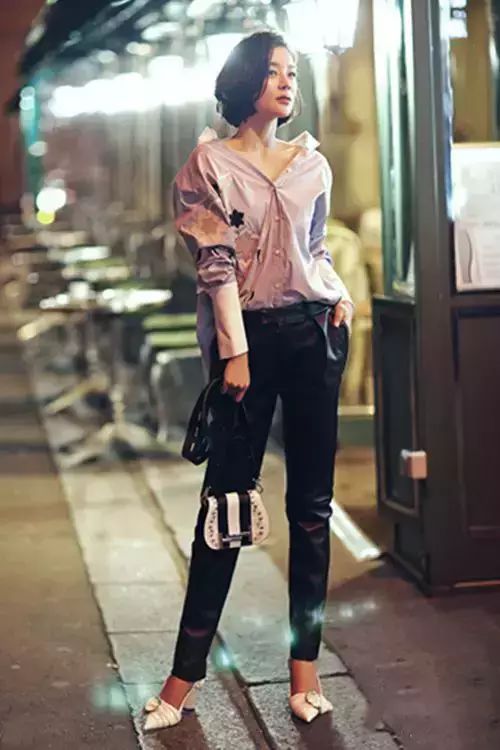 有的姑娘会觉得说,我肚子上有点肉,可以穿短款上衣吗?可以,但是要选择高腰裤搭配!