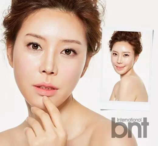 之后,在鼻部、下巴、全部、眉间涂抹高光产品,赋予肌肤自然光彩,在面部两遍及发际线线处涂抹修容粉,缩小面容。
